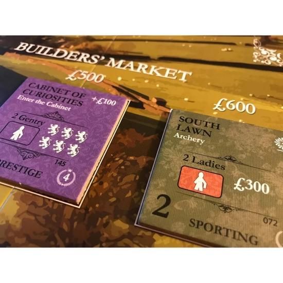 毎ターン、プレイヤーは19世紀イギリスのカントリーハウスとその周辺の部屋や屋外スペースを表す建物タイルを1枚選びます。選んだタイルによって、開催できるイベントと招待客が決まります。ただし、イベントの運営やゲストのサポートに必要なスタッフを用意するため、プレイヤーは慎重に計画を立てなければなりません。成功の報酬は、新たな投資機会、領地のさらなる改築(より高価で強力な建物タイルの取得)、郡内での評判の上昇、有力な知人の輪の拡大、より大規模で高度な訓練を受けた使用人達です。