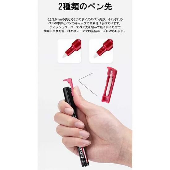 本体上部のキャップ部分に、交換用のペン先が付属しています。0.5mm/2mmのペン先によりパーツの大きさによって、お好みで付け替えができます。