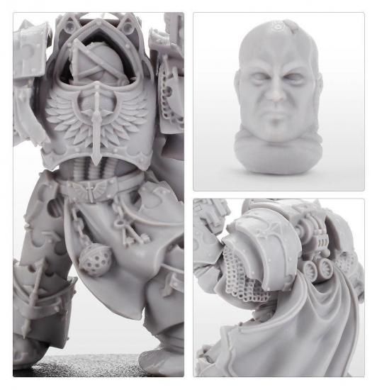このマルチパーツレジンキットは、ダークエンジェル軍団の重装指揮官、レギオン・カタフラクティ・プラエトルを1体組み立てることができます。強力なカリバナイト・ウォーブレードと、第一軍団の翼で装飾されたヴォルカイト・チャージャーを装備したこの堂々としたフィギュアは、バロック様式の栄誉とダークエンジェルの図像、ボリュームのあるマント、そして鎖帷子の縁飾りといったゴシック調のディテールで覆われた、華麗なカタフラクティ・ターミネーター・アーマーを身にまとっています。キットには、素顔と厳かなヘルメットの2種類のヘッドパーツが付属しています。