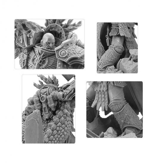 激しい心を持つサラマンダーの総主長であるヴルカンは、必要な時にいつでも呼び出されます。それは、彼が故郷と呼ぶ激動の世界を焼き尽くす炎のように、容赦なく破壊的な力を持っています。この絵では、ヴルカンは強力な鎚「ドーンブリンガー」を高く掲げ、フェラス・マヌスから遺贈された特注のボルター「炉の心臓」を装備しています。熟練のウォーハンマー愛好家にとって、ヴルカンの「ドレイケン・スケール」アーマーは精緻なディテールで装飾され、ペイントの難題となるでしょう。片方の肩には巨大な火竜カサレの頭蓋骨が乗っており、竜の鱗のような外套がプリマークの航跡をなびかせています。ヴァルカンには40mmのゲーミングベースが付属し、戦争で荒廃した環境と2人の戦死したスペースマリーンを再現した60mmの大型ディスプレイベースに