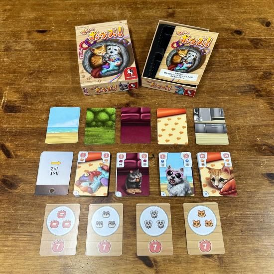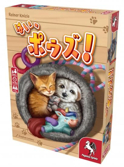 『はい、ポウズ!』でプレイヤーは動物が大好きなインフルエンサーとなり、SNS上でより多くの「肉球」を集めてコンテスト優勝を目指します。まず5枚の手札のうち1枚を伏せて出します。全員出したら同時に表向きにして、出したカードの肉球が一番多いプレイヤーから順に、出したカードと場のカードを交換していきます。