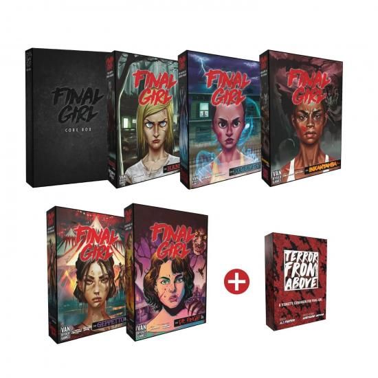 ソロ専用ゲーム『ファイナル・ガール』の「コアボックス」と、すべての「フィーチャーフィルムボックス」とミニ拡張『上空からの恐怖』がセットになっているプレッジです。
